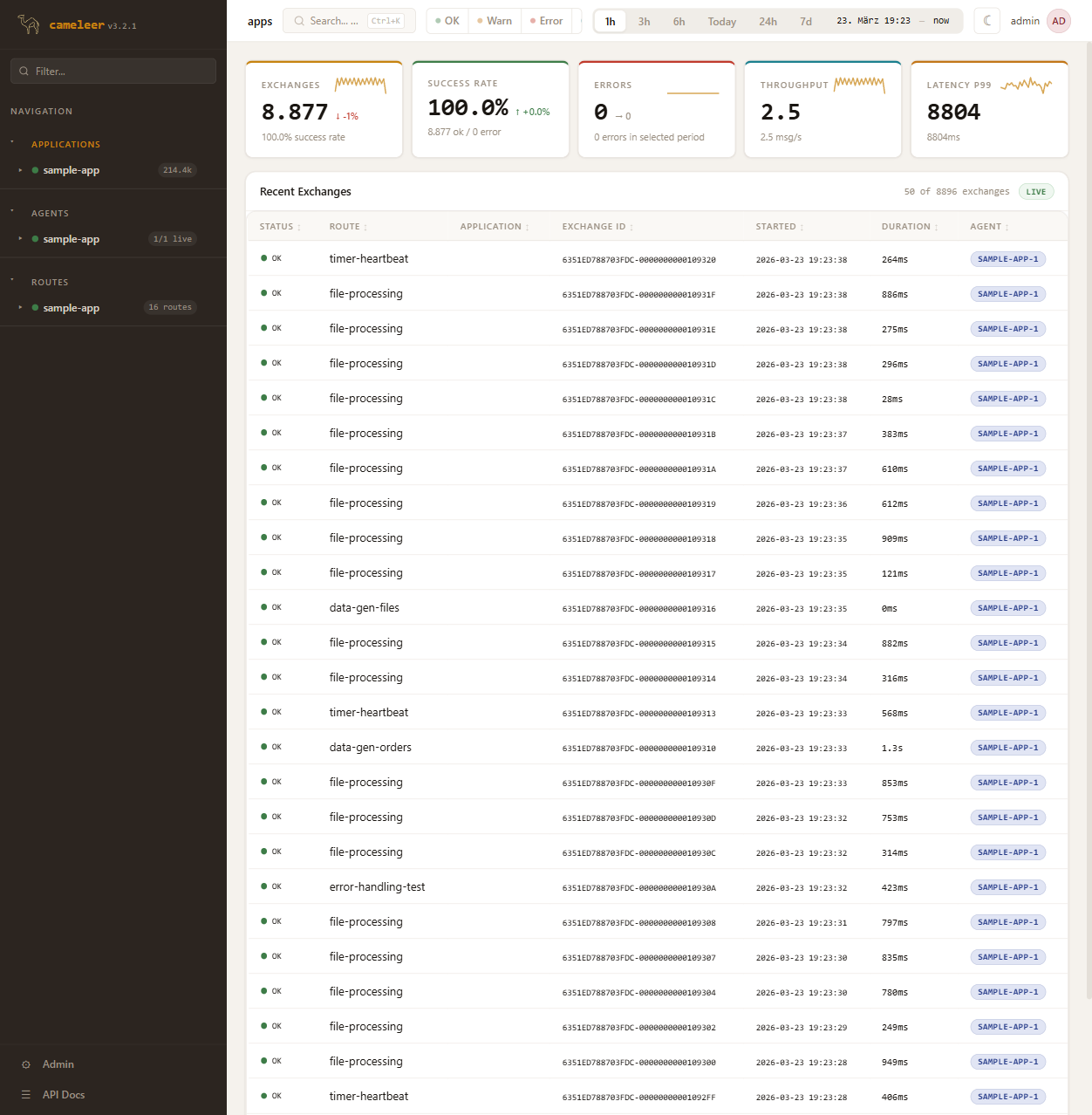 The execution-related "group" concept actually represents the application name. Rename all Java fields, API parameters, and frontend types from groupName→applicationName and group→application for clarity. - Java records: ExecutionSummary, ExecutionDetail, ExecutionDocument, ExecutionRecord, ProcessorRecord - API params: SearchRequest.group→application, SearchController @RequestParam group→application - Services: IngestionService, DetailService, SearchIndexer, StatsStore - Frontend: schema.d.ts, Dashboard, ExchangeDetail, RouteDetail, executions query hooks Database column names (group_name) and OpenSearch field names are unchanged — only the API-facing Java/TS field names are renamed. RBAC group references (groups table, GroupRepository, GroupsTab) are a separate domain concept and are NOT affected by this change. Co-Authored-By: Claude Opus 4.6 (1M context) <noreply@anthropic.com>